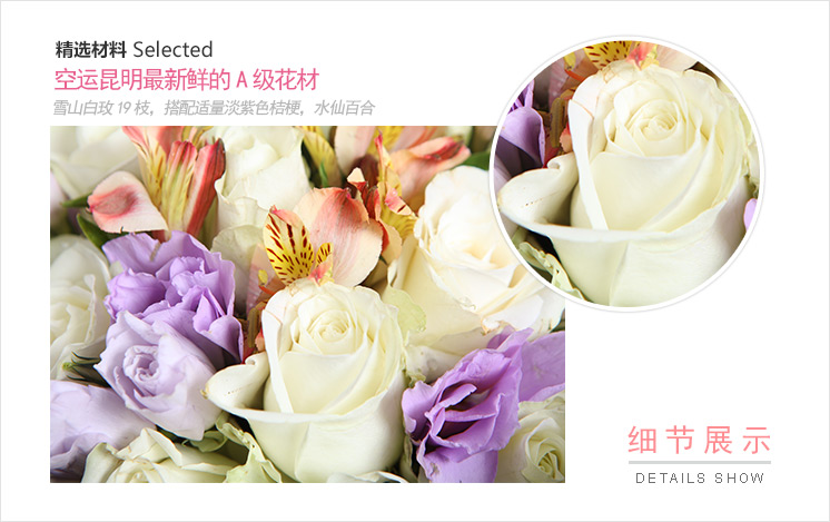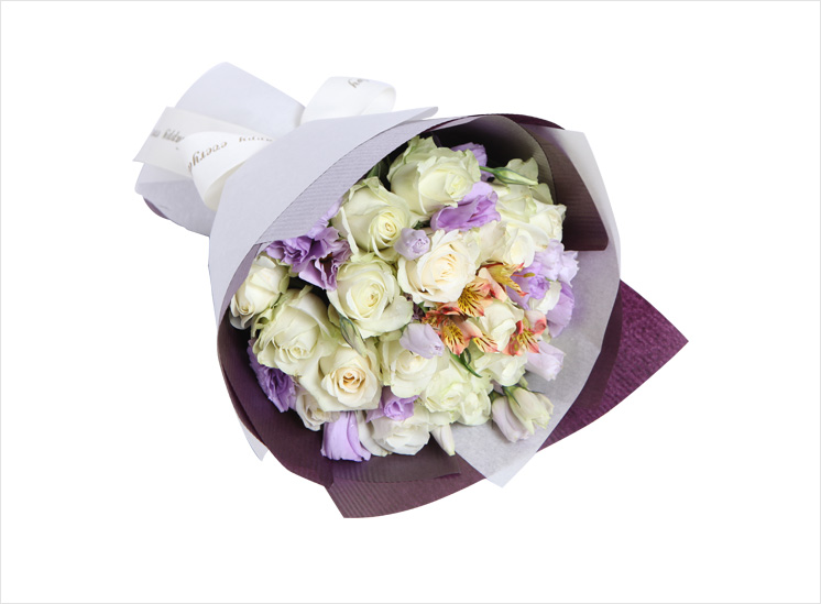 雪山白玫瑰19枝,搭配適量淡紫色桔梗及配花水仙百合