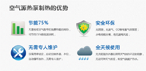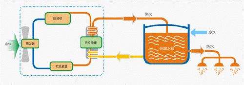 大量吸收空氣能中的免費熱能而制熱。通過將水箱的冷水循環加熱,最終加熱至設定溫度