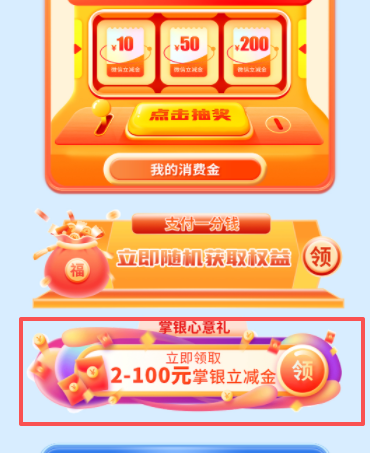 4.活動(dòng)期間每位客戶可參與1次“掌銀心意禮”活動(dòng),有機(jī)會(huì)獲得2-100元掌銀支付立減金,總計(jì)發(fā)放8萬份,先到先得,具體信息詳見活動(dòng)頁面。