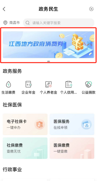 3.微信掃描活動(dòng)二維碼進(jìn)入農(nóng)行掌銀“政務(wù)民生”頁面,或者直接進(jìn)入農(nóng)行掌銀APP“生活”-“政務(wù)民生”,點(diǎn)擊“江西地方政府消費(fèi)券”-“月月有‘金’喜”,進(jìn)入活動(dòng)頁面參加活動(dòng)。
