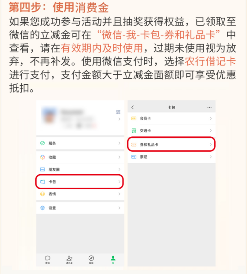 2.若客戶掌銀已綁定微信,微信立減金將自動(dòng)發(fā)放至已綁定微信卡包;若客戶掌銀未綁定,可前往掌銀“我的-安全中心-登錄設(shè)置-微信登錄”設(shè)置,綁定后前往掌銀“我的-禮券”領(lǐng)取至微信卡包。領(lǐng)取需在微信立減金有效期內(nèi),過期則無法領(lǐng)取。已領(lǐng)取至微信的立減金可在“微信-我-卡包-券和禮品卡”中查看,有效期至2026年1月5日24:00,過期未使用視為放棄,不再補(bǔ)發(fā)。使用微信支付時(shí),選擇農(nóng)行借記卡進(jìn)行支付,支付金額大于立減金面額即可享受優(yōu)惠抵扣。