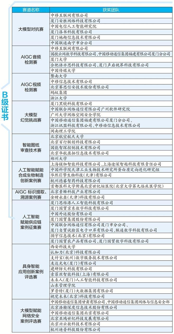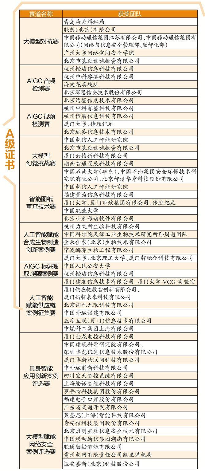 備受關注的第六屆中國人工智能大賽頒獎儀式也在主論壇上舉行。本次大賽聚焦國家部委業務需求、行業熱點、產業發展實際,設置大模型對抗賽、人工智能賦能供應鏈案例征集賽、AIGC視頻檢測賽等10道賽題,共吸引到近千支隊伍報名參賽,累計提交參賽項目1200多個。經過激烈角逐,100支優秀團隊脫穎而出,分別獲得A級證書或B級證書。