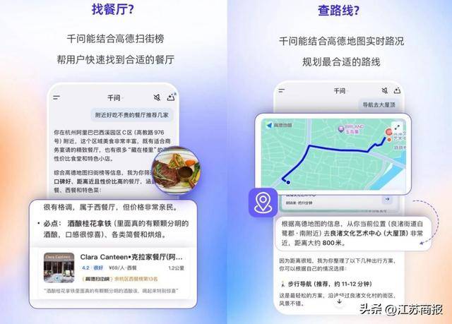 在最新版本中,這種能力已初步顯現。千問APP不再只是生成一段文字建議,而是能夠調用高德地圖、掃街榜等底層服務,即時生成包含推薦餐廳、酒店、地理位置及出行方案的可視化決策卡片。用戶點擊卡片,即可喚起導航或打車。